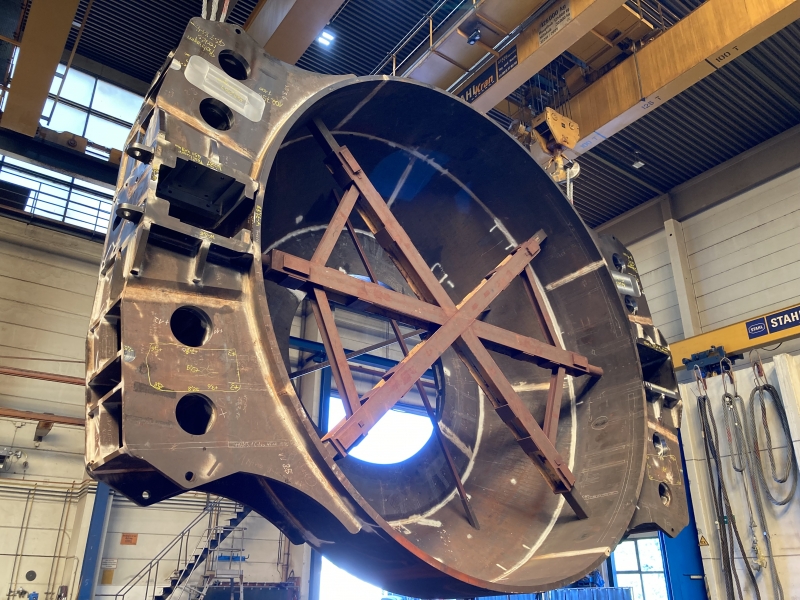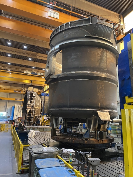 Big-bigger-DILEBSpeciality: LadlesBy using our combined boring mill, we are able to machine parts with a length of up to 36 meters. Furthermore, we have the possibility of parallel machining of 2 parts as shown on the pictures. Here is shown a casting ladle (LxWxH: 6.5 x 5.3 x 6.5 m) with a capacity of 400 tonnes of liquid steel and the upper part of a converter (LxWxH: 10 x 3.5 x 8 m) with a weight of 140 tonnes. |